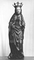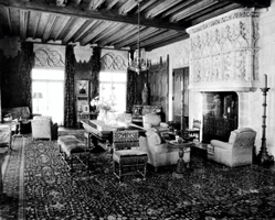 Images from the Archive Album 110 contains an image of the Living Room at Sands Point with oak paneling from Hamilton Palace, Scotland. The 15th century carved oak figure of a saint was purchased by Hearst from French & Company Inc. and was transferred to Sands Point in 1931. It also contains an image of the Great Hall adorned with suits of armor and a female reliquary bust.